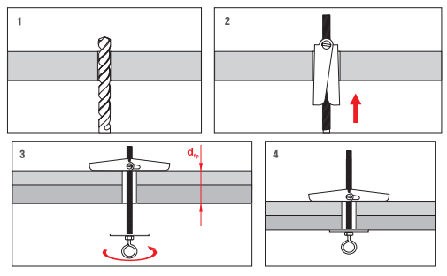 Преимущества: Как только пружинный механизм попадает в пустоту, стопорные крылья сразу же раскрываются, таким образом образуется надёжная фиксация дюбеля.